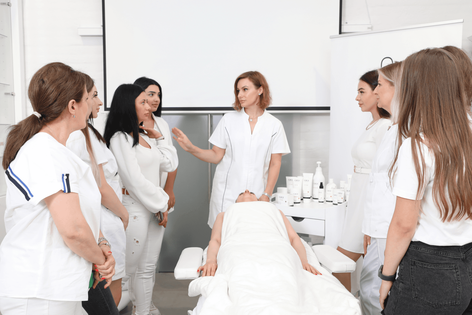 Intenzivní praxe od 2. týdne, trénink nových technik na modelkách i navzájem s použitím prémiových produktů v ceně kurzu.